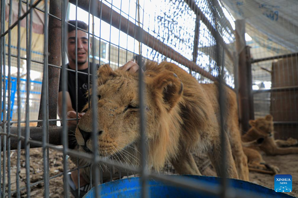 GAZA, 24 mayo, 2024 (Xinhua) -- Imagen del 23 de mayo de 2024 de un niño cuidando a un león evacuado del Zoológico de Rafah en una instalación de guardería, en la ciudad de Khan Younis, en el sur de la Franja de Gaza. Estos animales han sido evacuados debido al actual conflicto palestino-israelí. (Xinhua/Rizek Abdeljawad)