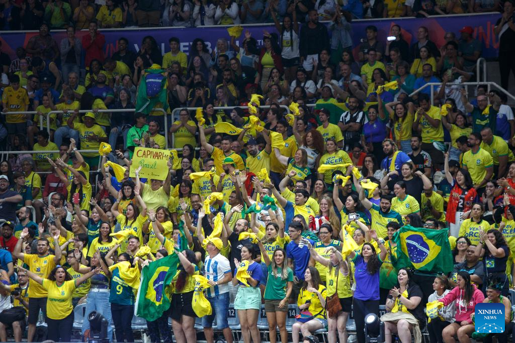 RIO DE JANEIRO, 24 mayo, 2024 (Xinhua) -- Imagen del 23 de mayo de 2024 de aficionados de Brasil reaccionando durante el partido de la ronda preliminar de la Liga de Naciones de Voleibol 2024 masculina de la Federación Internacional de Voleibol (FIVB) entre Argentina y Brasil, en Río de Janeiro, Brasil. (Xinhua/Claudia Martini)