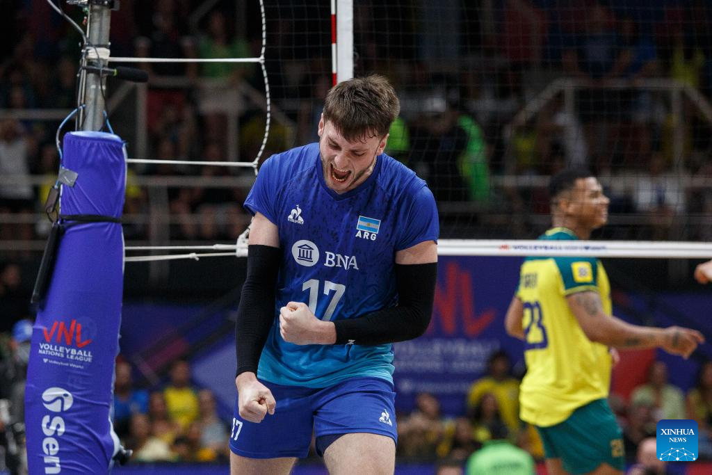 RIO DE JANEIRO, 24 mayo, 2024 (Xinhua) -- Imagen del 23 de mayo de 2024 del jugador Luciano Vicentín (frente), de Argentina, reaccionando durante el partido de la ronda preliminar de la Liga de Naciones de Voleibol 2024 masculina de la Federación Internacional de Voleibol (FIVB) entre Argentina y Brasil, en Río de Janeiro, Brasil. (Xinhua/Claudia Martini)