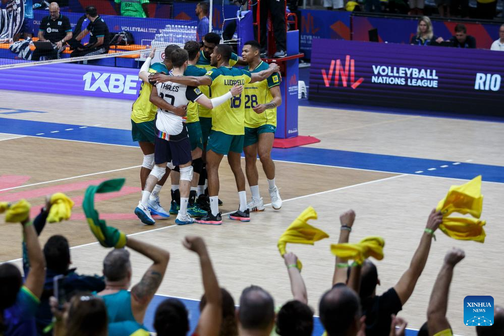 RIO DE JANEIRO, 24 mayo, 2024 (Xinhua) -- Imagen del 23 de mayo de 2024 de jugadores de Brasil festejando durante el partido de la ronda preliminar de la Liga de Naciones de Voleibol 2024 masculina de la Federación Internacional de Voleibol (FIVB) entre Argentina y Brasil, en Río de Janeiro, Brasil. (Xinhua/Claudia Martini)
