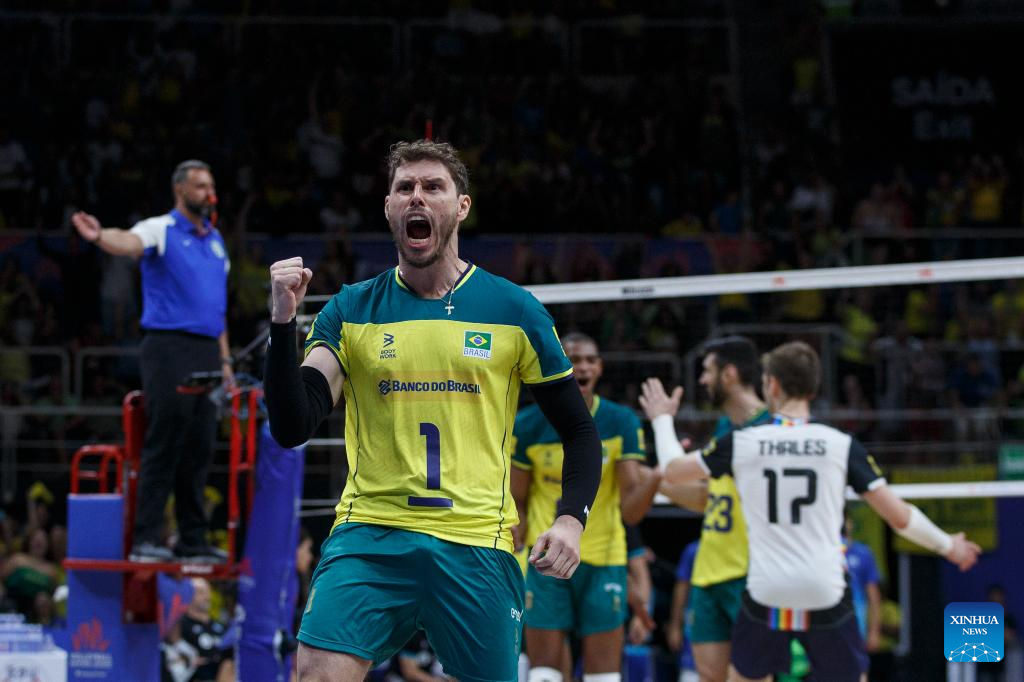 RIO DE JANEIRO, 24 mayo, 2024 (Xinhua) -- Imagen del 23 de mayo de 2024 del jugador Bruno Mossa Rezende (frente), de Brasil, festejando durante el partido de la ronda preliminar de la Liga de Naciones de Voleibol 2024 masculina de la Federación Internacional de Voleibol (FIVB) entre Argentina y Brasil, en Río de Janeiro, Brasil. (Xinhua/Claudia Martini)