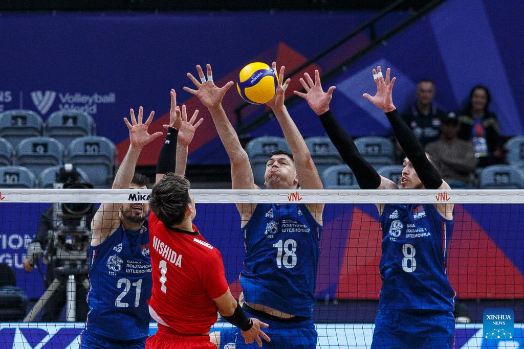 RIO DE JANEIRO, 24 mayo, 2024 (Xinhua) -- Imagen el 23 de mayo de 2024 de Marko Podrascanin (2-d-atrás), de Serbia, bloqueando el balón durante el partido de la ronda preliminar de la Liga de Naciones de Voleibol 2024 masculina de la Federación Internacional de Voleibol (FIVB) entre Japón y Serbia, en Río de Janeiro, Brasil. (Xinhua/Claudia Martini)