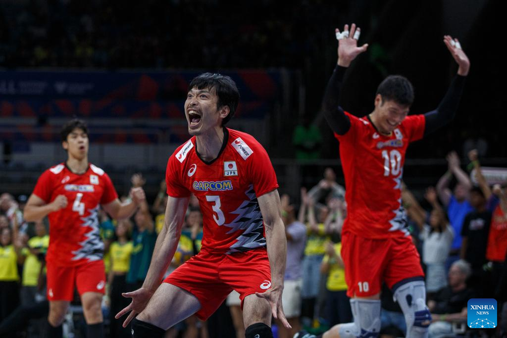 RIO DE JANEIRO, 24 mayo, 2024 (Xinhua) -- Imagen el 23 de mayo de 2024 de jugadores de Japón festejando durante el partido de la ronda preliminar de la Liga de Naciones de Voleibol 2024 masculina de la Federación Internacional de Voleibol (FIVB) entre Japón y Serbia, en Río de Janeiro, Brasil. (Xinhua/Claudia Martini)