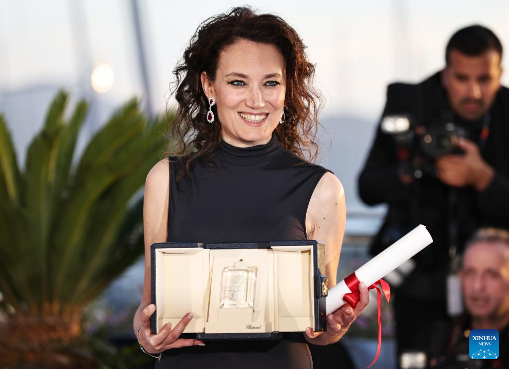 CANNES, 26 mayo, 2024 (Xinhua) -- Imagen del 25 de mayo de 2024 de la directora francesa Coralie Fargeat posando después de ganar el premio al mejor guión por la película "The Substance" durante la ceremonia de clausura de la edición 77 del Festival de Cine de Cannes, en Cannes, en el sur de Francia. (Xinhua/Gao Jing)