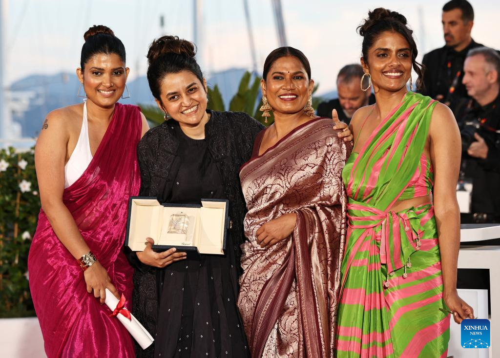 CANNES, 26 mayo, 2024 (Xinhua) -- Imagen del 25 de mayo de 2024 de la directora india Payal Kapadia (2-i) posando con miembros del elenco después de ganar el Gran Premio por la película "All We Imagine as Light" durante la ceremonia de clausura de la edición 77 del Festival de Cine de Cannes, en Cannes, en el sur de Francia. (Xinhua/Gao Jing)