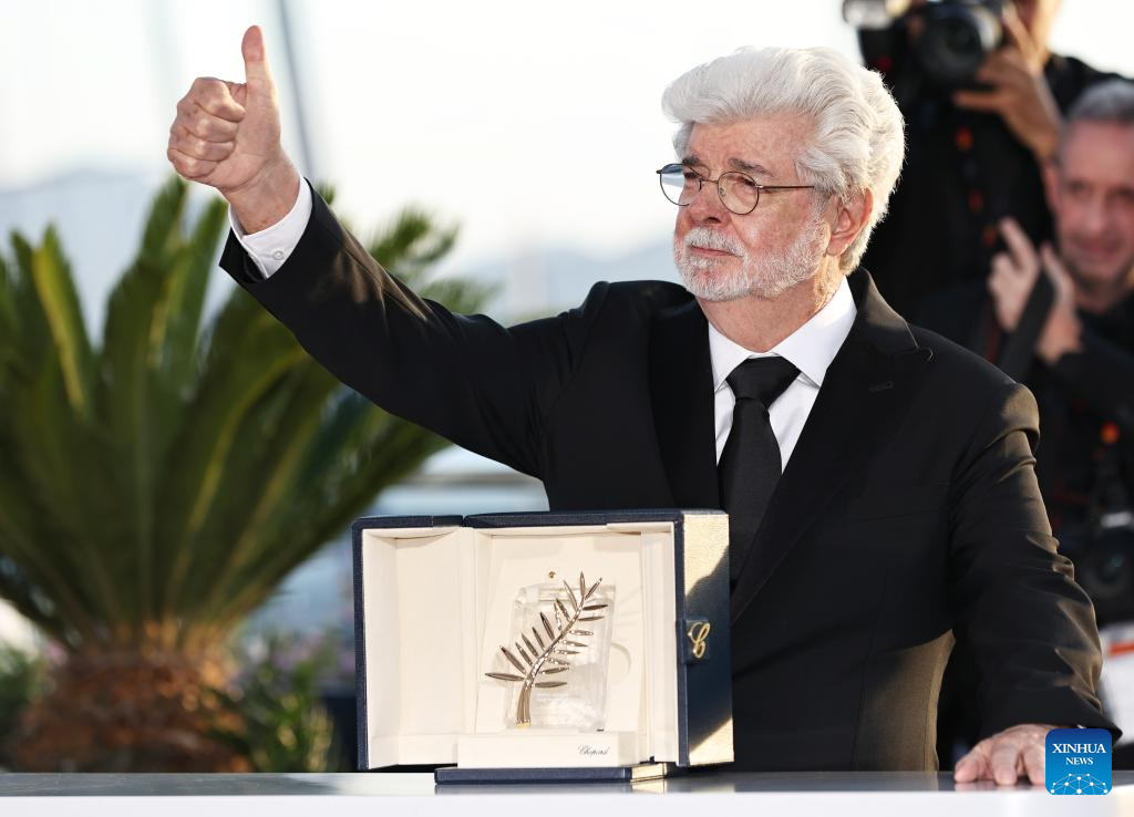 CANNES, 26 mayo, 2024 (Xinhua) -- Imagen del 25 de mayo de 2024 del director estadounidense George Lucas posando con su Palma de Oro Honorífica durante la ceremonia de clausura de la edición 77 del Festival de Cine de Cannes, en Cannes, en el sur de Francia. (Xinhua/Gao Jing)