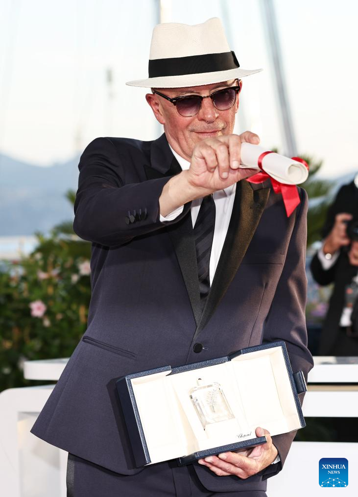 CANNES, 26 mayo, 2024 (Xinhua) -- Imagen del 25 de mayo de 2024 del director francés Jacques Audiard posando después de ganar el Premio del Jurado por la película "Emilia Pérez" durante la ceremonia de clausura de la edición 77 del Festival de Cine de Cannes, en Cannes, en el sur de Francia. (Xinhua/Gao Jing)