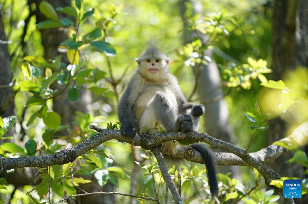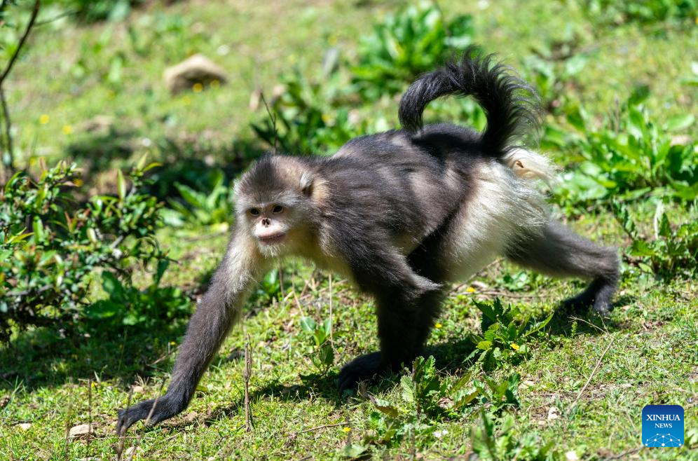 DISTRITO DE WEIXI, 24 mayo, 2024 (Xinhua) -- Imagen del 23 de marzo de 2024 de un mono de nariz chata visto en la Reserva Natural Nacional de la Montaña Nevada de Baima, en la provincia de Yunnan, en el suroeste de China. El mono de nariz chata blanco y negro, también conocido como mono de pelo dorado de Yunnan, es un animal protegido de primera clase nacional de China. La especie también figura en la Lista Roja de la Unión Internacional para la Conservación de la Naturaleza (IUCN, por sus siglas en inglés). (Xinhua/Chen Xinbo)