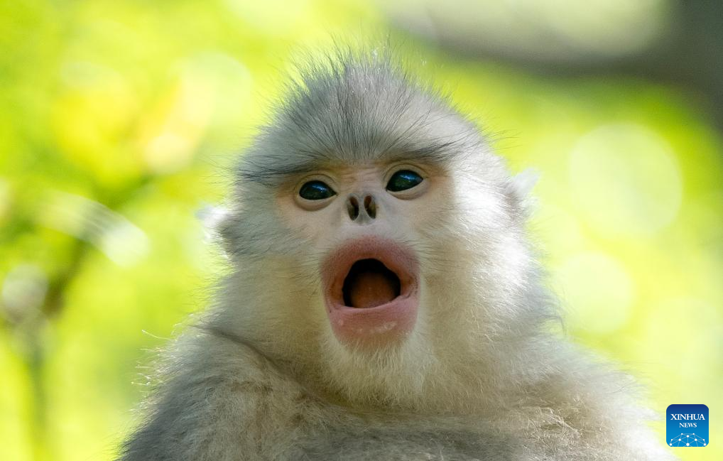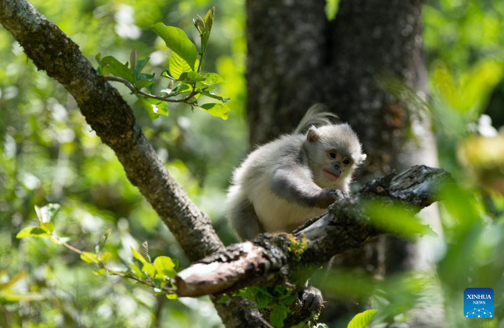 DISTRITO DE WEIXI, 24 mayo, 2024 (Xinhua) -- Imagen del 23 de marzo de 2024 de una cría de mono de nariz chata visto en la Reserva Natural Nacional de la Montaña Nevada de Baima, en la provincia de Yunnan, en el suroeste de China. El mono de nariz chata blanco y negro, también conocido como mono de pelo dorado de Yunnan, es un animal protegido de primera clase nacional de China. La especie también figura en la Lista Roja de la Unión Internacional para la Conservación de la Naturaleza (IUCN, por sus siglas en inglés). (Xinhua/Chen Xinbo)