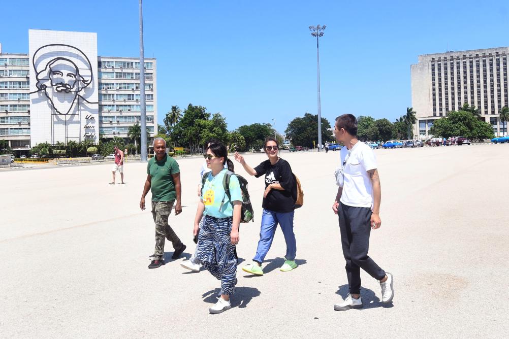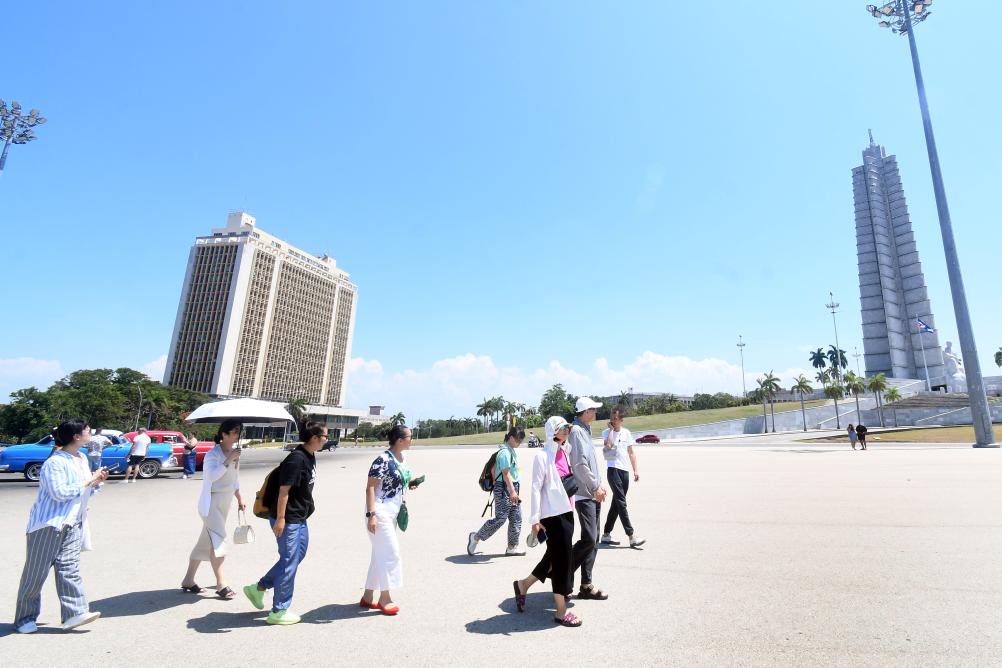 Imagen del 23 de mayo 2024 de turistas chinos caminando por la Plaza de la Revolución, en La Habana, capital de Cuba. Tras el reciente reinicio de los vuelos de la aerolínea Air China entre Beijing y La Habana vía Madrid, y la decisión del Gobierno cubano de otorgar libre visado a los turistas chinos, las autoridades de la isla están enfocadas en promocionar los atractivos de la isla caribeña. (Xinhua/Joaquín Hernández)