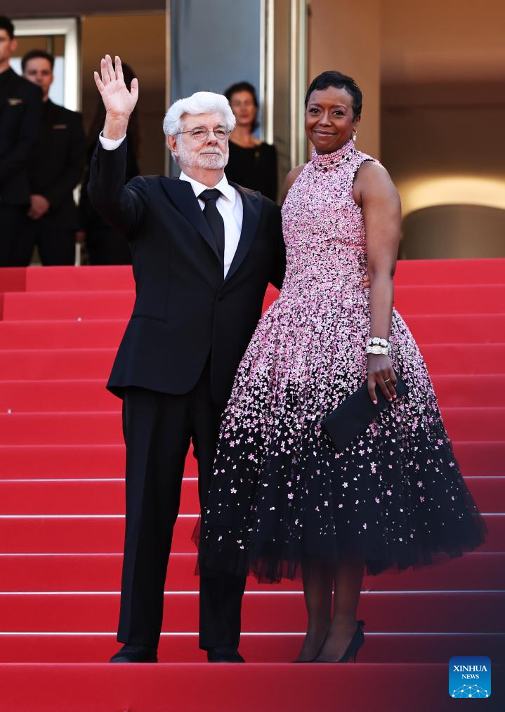 CANNES, 26 mayo, 2024 (Xinhua) -- Imagen del 25 de mayo de 2024 del director estadounidense, George Lucas (i), llegando a la ceremonia de clausura de la 77 edición del Festival de Cine de Cannes, en Cannes, en el sur de Francia. (Xinhua/Gao Jing)
