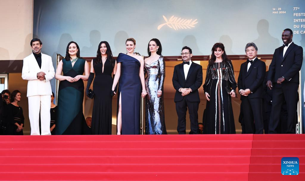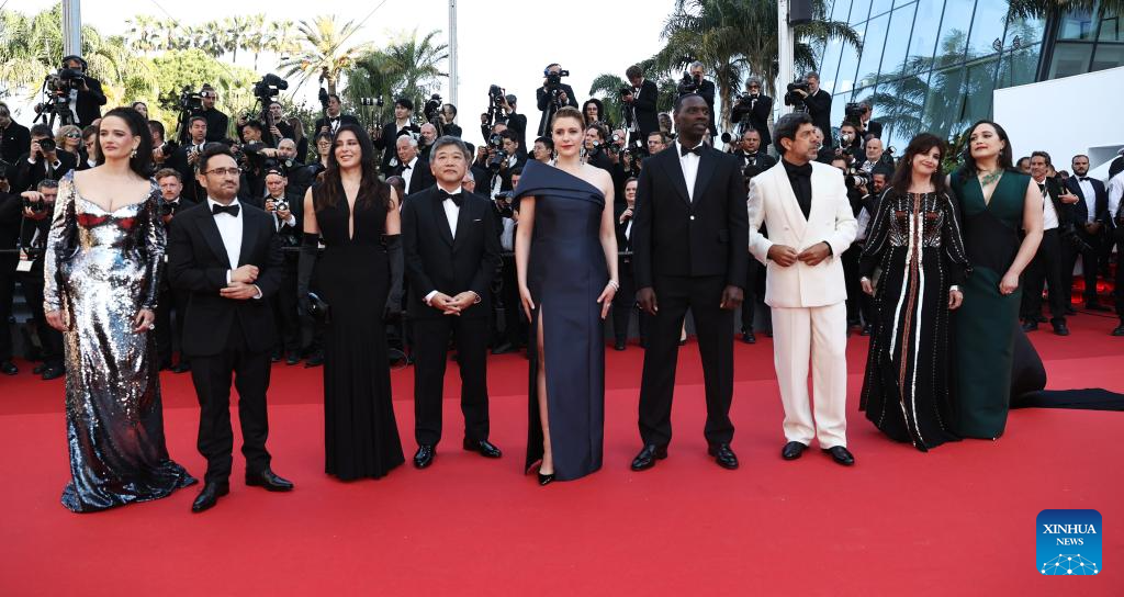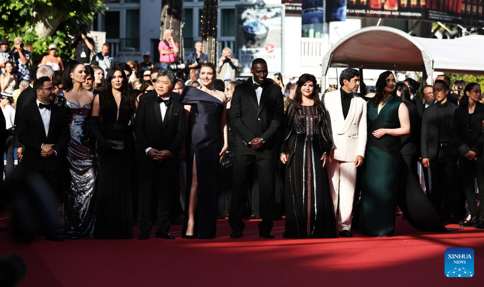 CANNES, 26 mayo, 2024 (Xinhua) -- Imagen del 25 de mayo de 2024 de miembros del jurado del 77 Festival de Cine de Cannes llegando a la ceremonia de clausura de la 77 edición del Festival de Cine de Cannes, en Cannes, en el sur de Francia. (Xinhua/Gao Jing)