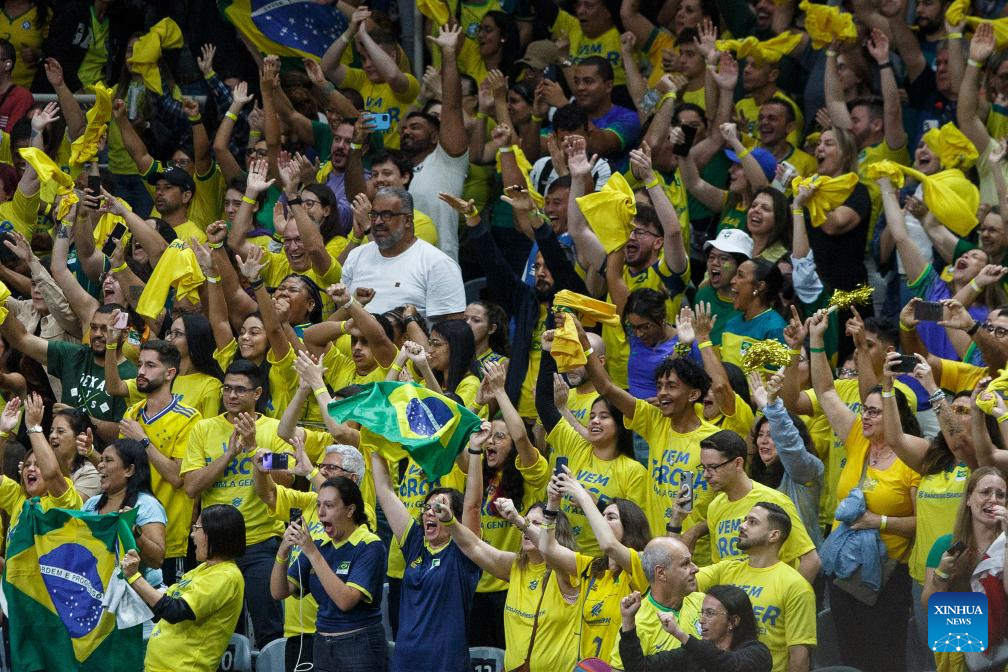 RIO DE JANEIRO, 26 mayo, 2024 (Xinhua) -- Aficionados de Brasil reaccionan durante el partido de la ronda preliminar de la Liga de Naciones de Voleibol 2024 masculina de la Federación Internacional de Voleibol (FIVB) entre Brasil e Italia, en Río de Janeiro, Brasil, el 26 de mayo de 2024. (Xinhua/Claudia Martini)