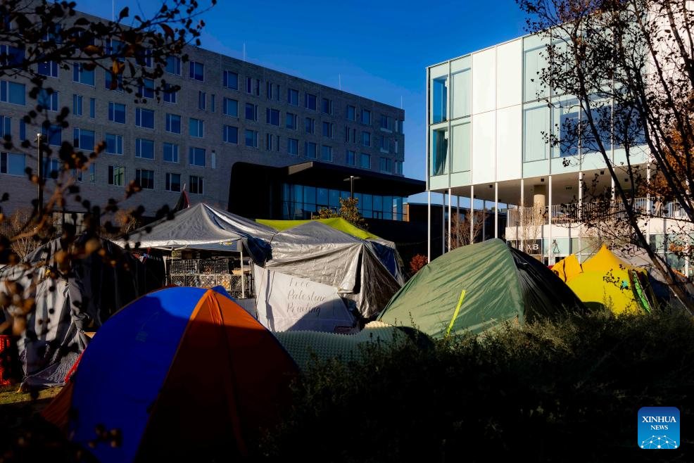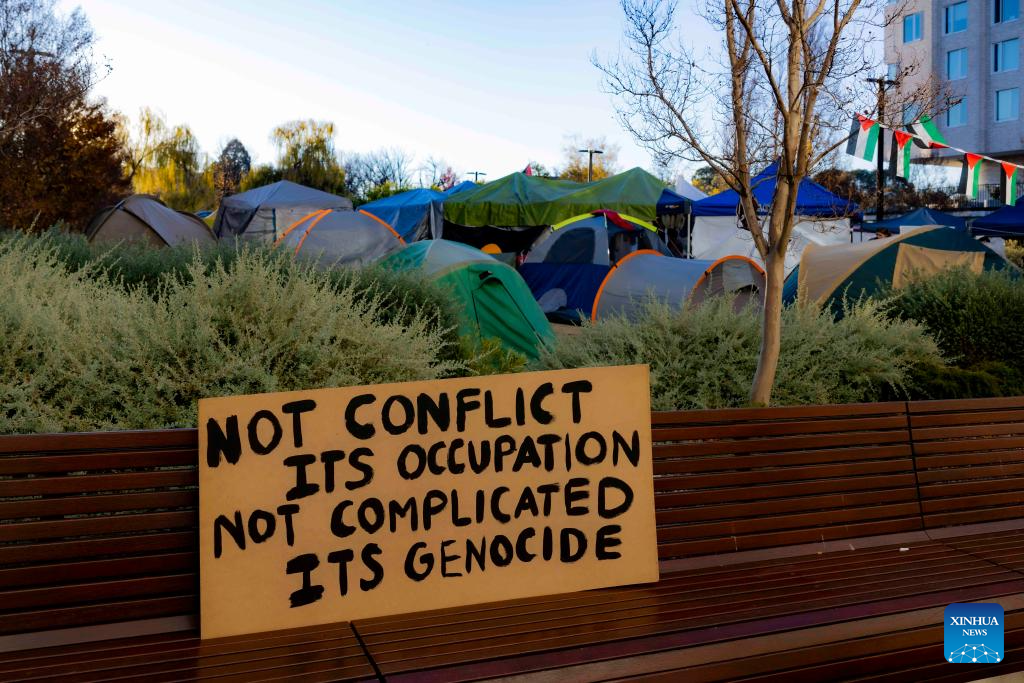 CANBERRA, 27 mayo, 2024 (Xinhua) -- Un campamento pro Palestina es visto en la Universidad Nacional de Australia (ANU, por sus siglas en inglés), en Canberra, Australia, el 27 de mayo de 2024. Los manifestantes estudiantiles han desafiado una orden de retirar un campamento pro Palestina en la ANU. La ANU el lunes ordenó oficialmente a los manifestantes que empaquen y retiren el campamento en su campus principal en los suburbios del norte de Canberra, citando serias preocupaciones de seguridad porque el campamento bloquea un sitio de evacuación para emergencias. Después de votar para desafiar la orden y mantenerse en el sitio los manifestantes formaron el lunes por la mañana una barrera humana alrededor del borde del campamento, de acuerdo con el medio estatal, la Australian Broadcasting Corporation (ABC). (Xinhua/Chu Chen)