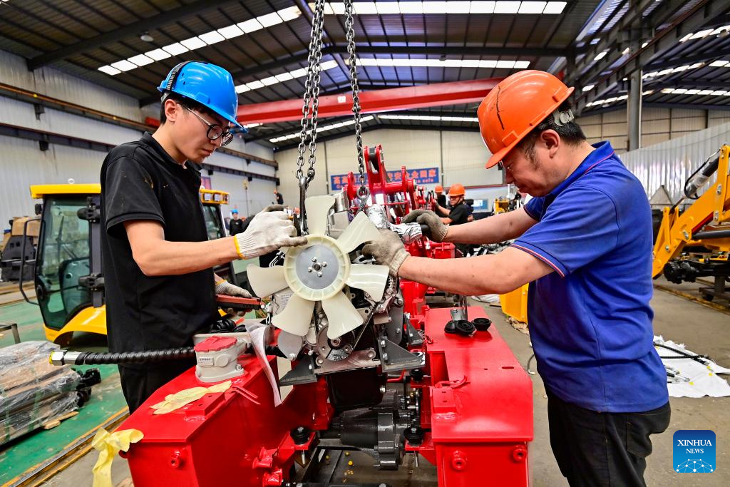 WEIFANG, 27 mayo, 2024 (Xinhua) -- Trabajadores ensamblan equipamiento en un fabricante de cargadores, en la ciudad de Qingzhou, en la provincia de Shandong, en el este de China, el 27 de mayo de 2024. El sector industrial de China registró un mayor impulso de crecimiento el mes pasado, con un fuerte repunte de las ganancias que sugiere una recuperación sostenida. Las ganancias de las principales empresas industriales de China aumentaron un 4 por ciento interanual en abril de 2024, revirtiendo una caída del 3,5 por ciento registrada el mes anterior, dijo el lunes el Buró Nacional de Estadísticas (BNE). El crecimiento de los ingresos de dichas empresas también experimentó un cambio con una expansión del 3,3 por ciento registrada el mes pasado, en comparación con una caída del 1,2 por ciento en marzo. (Xinhua/Wang Jilin)
