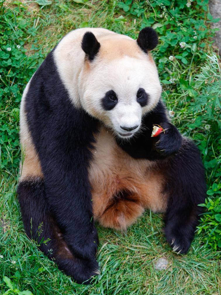 CHENGDU, 28 mayo, 2024 (Xinhua) -- Imagen del 27 de mayo de 2024 del panda gigante, Fu Bao, comiendo una manzana en la base de pandas gigantes de Shenshuping en la Reserva Natural Nacional de Wolong, en la provincia de Sichuan, en el suroeste de China. Fu Bao, el primer panda gigante nacido en República de Corea, regresó a China a principios de abril. Fue trasladado a la base de pandas gigantes de Shenshuping en la Reserva Natural Nacional de Wolong. La base preparó una área especialmente diseñada para Fu Bao para ayudarlo a adaptarse al nuevo entorno y determinará cuándo hacer que Fu Bao se reúna con el público en función de su adaptación. (Xinhua/Shen Bohan)