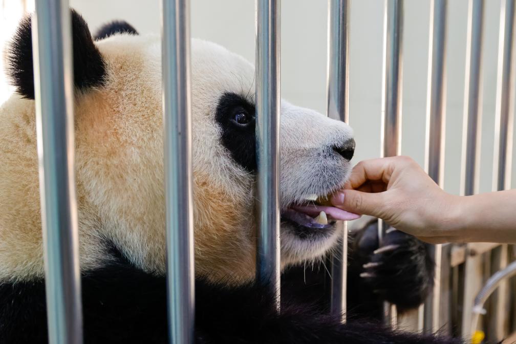 CHENGDU, 28 mayo, 2024 (Xinhua) -- Imagen del 27 de mayo de 2024 del panda gigante, Fu Bao, siendo alimentado en la base de pandas gigantes de Shenshuping en la Reserva Natural Nacional de Wolong, en la provincia de Sichuan, en el suroeste de China. Fu Bao, el primer panda gigante nacido en República de Corea, regresó a China a principios de abril. Fue trasladado a la base de pandas gigantes de Shenshuping en la Reserva Natural Nacional de Wolong. La base preparó una área especialmente diseñada para Fu Bao para ayudarlo a adaptarse al nuevo entorno y determinará cuándo hacer que Fu Bao se reúna con el público en función de su adaptación. (Xinhua/Shen Bohan)