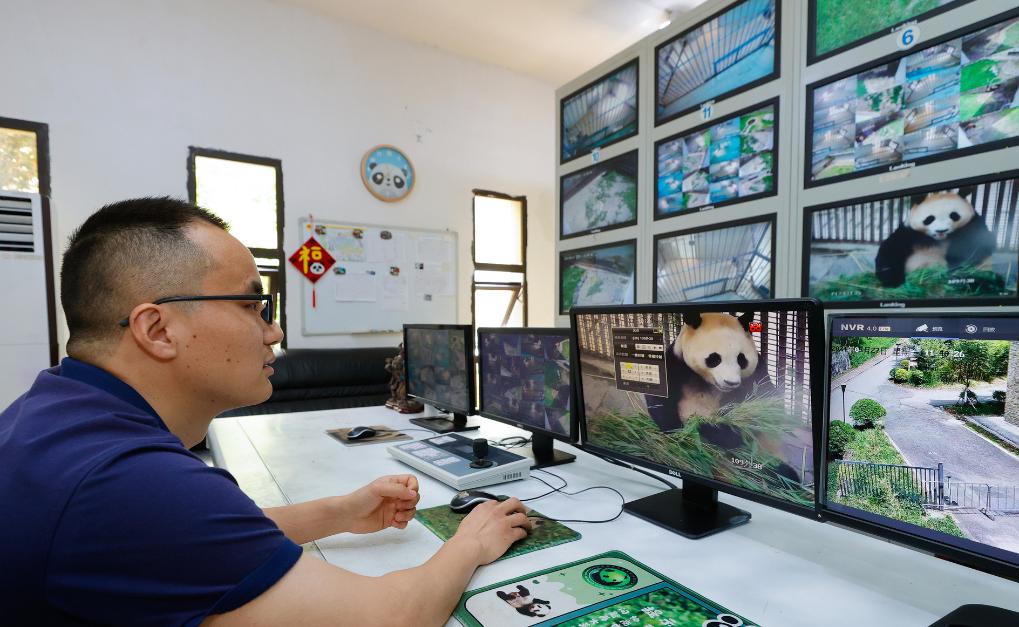 CHENGDU, 28 mayo, 2024 (Xinhua) -- Imagen del 27 de mayo de 2024 de un alimentador monitoreando al panda gigante Fu Bao, en la base de pandas gigantes de Shenshuping en la Reserva Natural Nacional de Wolong, en la provincia de Sichuan, en el suroeste de China. Fu Bao, el primer panda gigante nacido en República de Corea, regresó a China a principios de abril. Fue trasladado a la base de pandas gigantes de Shenshuping en la Reserva Natural Nacional de Wolong. La base preparó una área especialmente diseñada para Fu Bao para ayudarlo a adaptarse al nuevo entorno y determinará cuándo hacer que Fu Bao se reúna con el público en función de su adaptación. (Xinhua/Shen Bohan)