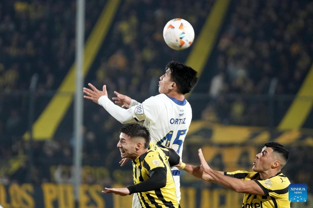 MONTEVIDEO, 29 mayo, 2024 (Xinhua) -- Imagen del 28 de mayo de 2024 de los jugadores Damián García (i-frente), y Leonardo Sequeira (d), de Peñarol de Uruguay, disputando el balón con Kevin Ortíz (c), de Rosario Central de Argentina, durante el partido correspondiente al Grupo G de la Copa Conmebol Libertadores, celebrado en el Estadio Campeón del Siglo, en Montevideo, capital de Uruguay. (Xinhua/Nicolás Celaya)