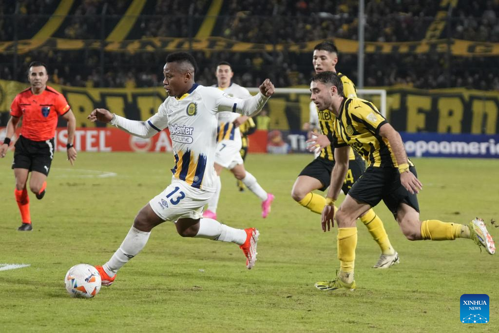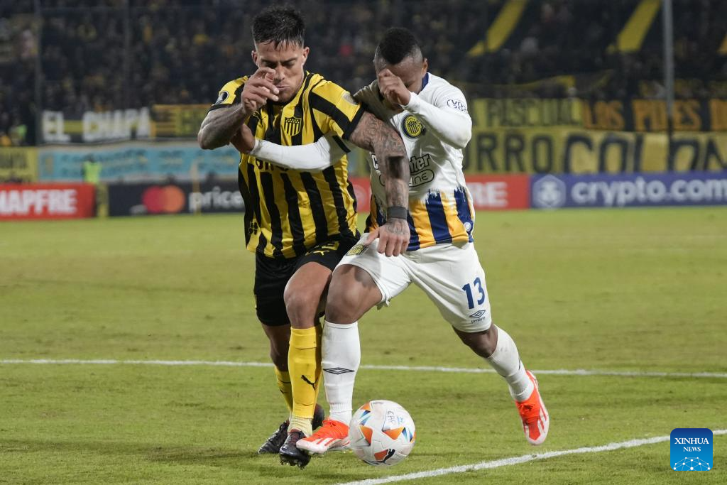 MONTEVIDEO, 29 mayo, 2024 (Xinhua) -- Imagen del 28 de mayo de 2024 del jugador Pedro Milans (d-frente), de Peñarol de Uruguay, disputando el balón con Jáminton Campaz (i-frente), de Rosario Central de Argentina, durante el partido correspondiente al Grupo G de la Copa Conmebol Libertadores, celebrado en el Estadio Campeón del Siglo, en Montevideo, capital de Uruguay. (Xinhua/Nicolás Celaya)