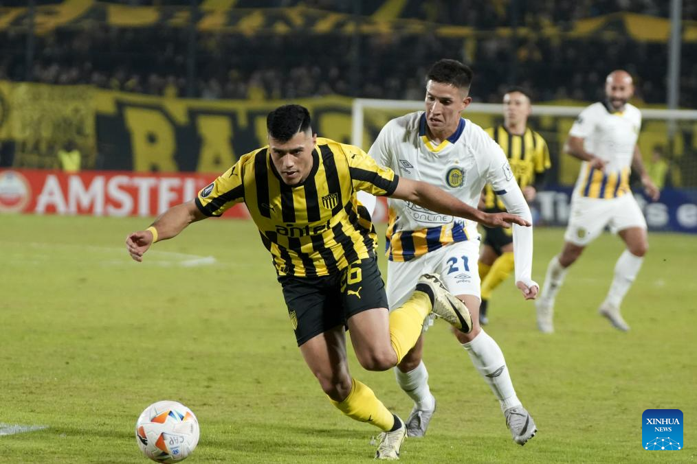 MONTEVIDEO, 29 mayo, 2024 (Xinhua) -- Imagen del 28 de mayo de 2024 del jugador Javier Méndez (i), de Peñarol de Uruguay, disputando el balón con Jáminton Campaz (d), de Rosario Central de Argentina, durante el partido correspondiente al Grupo G de la Copa Conmebol Libertadores, celebrado en el Estadio Campeón del Siglo, en Montevideo, capital de Uruguay. (Xinhua/Nicolás Celaya)