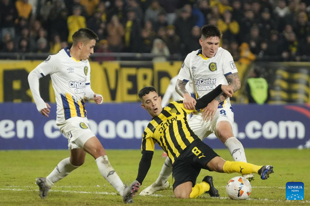 MONTEVIDEO, 29 mayo, 2024 (Xinhua) -- Imagen del 28 de mayo de 2024 del jugador Leonardo Fernández (c), de Peñarol de Uruguay, disputando el balón Franco Ibarra (d), de Rosario Central de Argentina, durante el partido correspondiente al Grupo G de la Copa Conmebol Libertadores, celebrado en el Estadio Campeón del Siglo, en Montevideo, capital de Uruguay. (Xinhua/Nicolás Celaya)