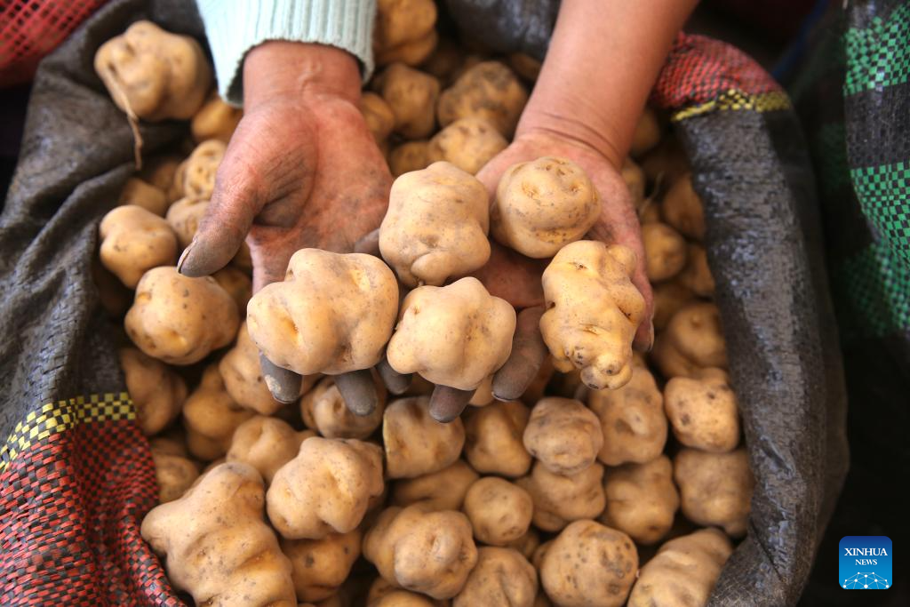 LIMA, 30 mayo, 2024 (Xinhua) -- Una agricultora muestra papas a la venta durante la feria "Cosechando la Diversidad, Alimentando la Esperanza" en el marco del Día Internacional de la Papa que se celebra el 30 de mayo, en el Parque de la Exposición, en Lima, Perú, el 30 de mayo de 2024. (Xinhua/Mariana Bazo)