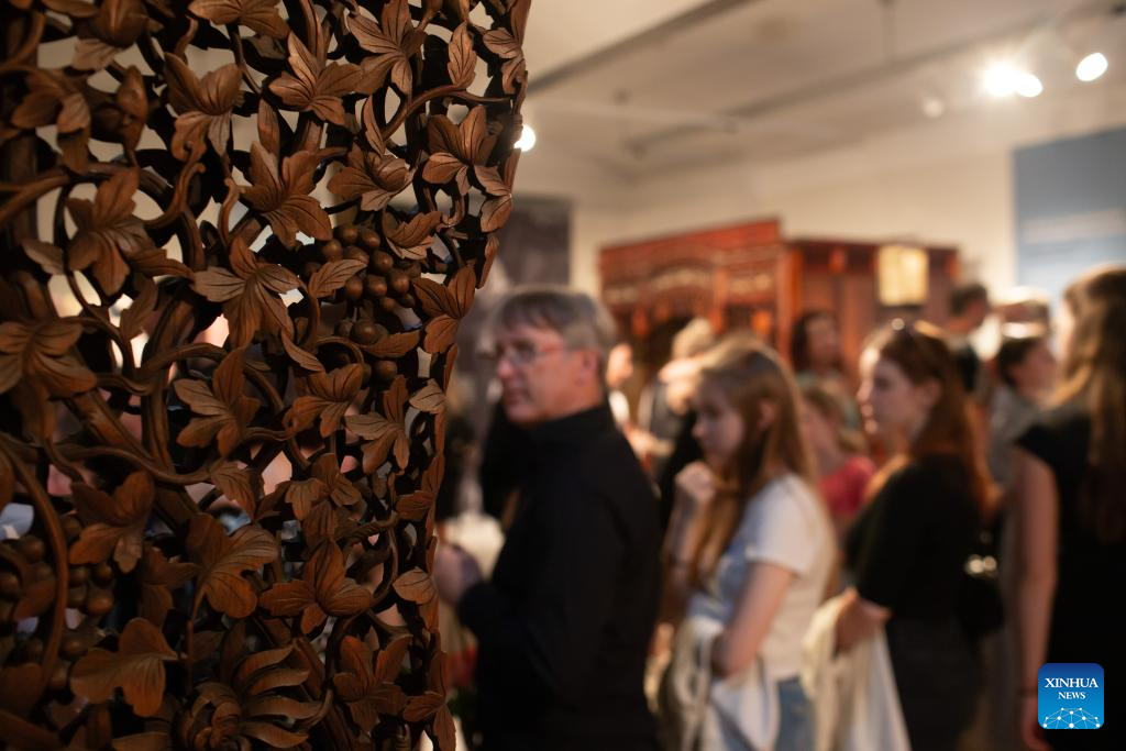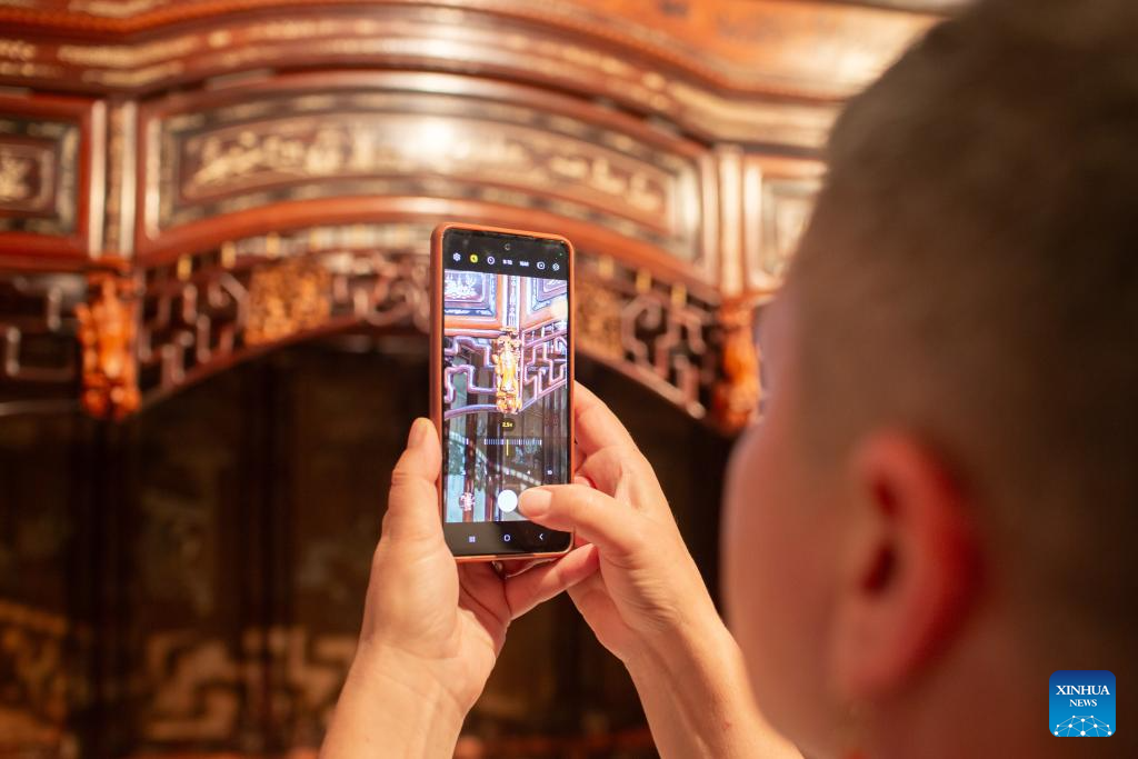 LIUBLIANA, 30 mayo, 2024 (Xinhua) -- Imagen del 29 de mayo de 2024 de un visitante tomando fotografías de una cama con dosel chino durante la exposición de la colección de Ivan Skusek en el Museo Etnográfico de Eslovenia, en Liubliana, Eslovenia. Más de un siglo después de su llegada a Eslovenia, un impresionante modelo de madera chino que representa una antigua puerta de tres tramos con techo a dos aguas hizo su debut público en Liubliana el martes, una de las 130 piezas expuestas en el Museo Etnográfico de Eslovenia, todas pertenecientes a la colección del fallecido coleccionista esloveno Ivan Skusek, que las trajo de China hace un siglo. (Xinhua/Zeljko Stevanic)
