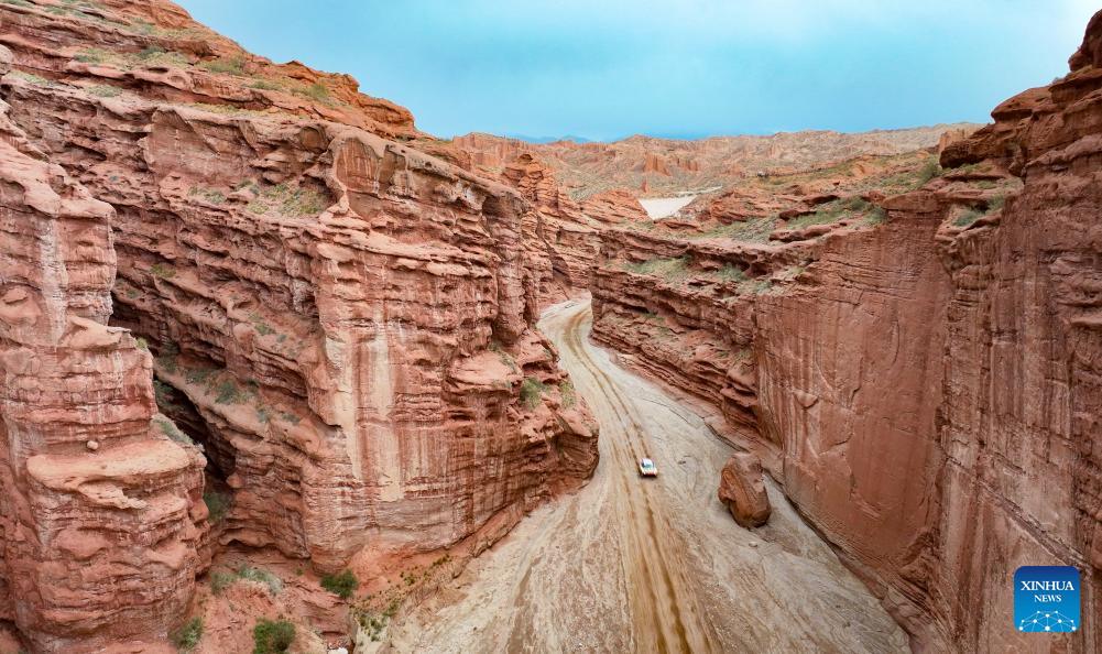AKSU, 31 mayo, 2024 (Xinhua) -- Vista aérea tomada con un dron el 31 de marzo de 2024 de un automóvil compitiendo durante la novena etapa del Rally Taklimakan 2024, en la región autónoma uygur de Xinjiang, en el noroeste de China. (Xinhua/Chen Shuo)