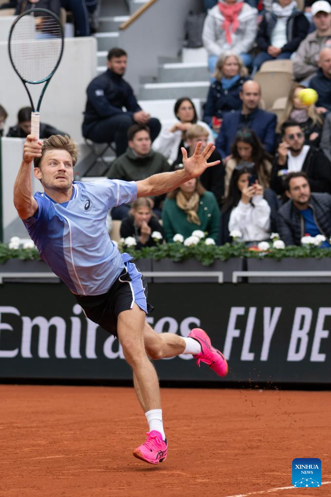 PARIS, 31 mayo, 2024 (Xinhua) -- Imagen del 30 de mayo de 2024 de David Goffin devolviendo la pelota durante el partido de la segunda ronda de individuales masculinos entre Alexander Zverev, de Alemania, y David Goffin, de Bélgica, en el torneo de tenis Abierto de Francia, en Roland Garros, en París, Francia. (Xinhua/Meng Dingbo)