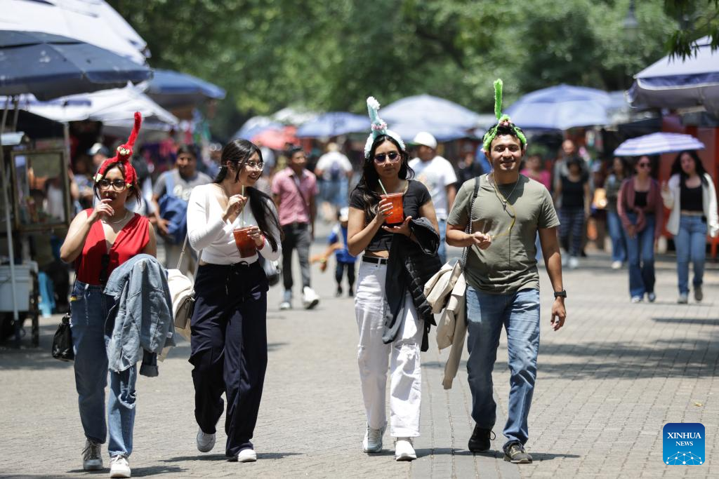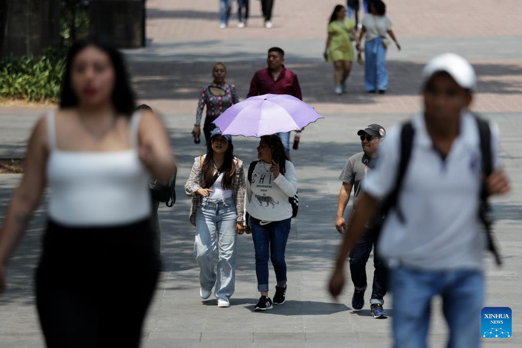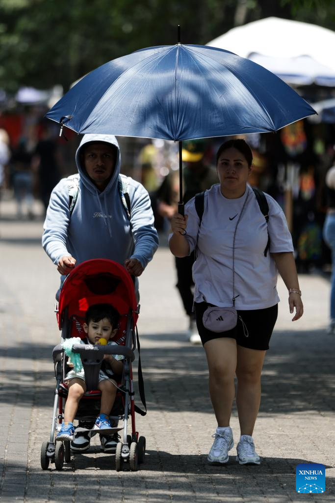 CIUDAD DE MEXICO, 30 mayo, 2024 (Xinhua) -- Personas se protegen del sol con una sombrilla mientras caminan por el Bosque de Chapultepec, en la Ciudad de México, capital de México, el 30 de mayo de 2024. (Xinhua/Francisco Cañedo)