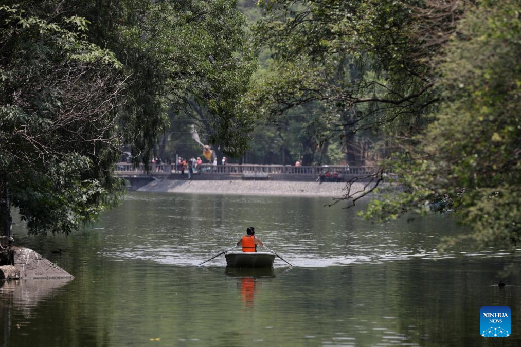 CIUDAD DE MEXICO, 30 mayo, 2024 (Xinhua) -- Una persona rema una lancha en el Lago de Chapultepec, en la Ciudad de México, capital de México, el 30 de mayo de 2024. (Xinhua/Francisco Cañedo)