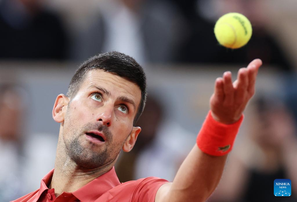 PARIS, 31 mayo, 2024 (Xinhua) -- Imagen del 30 de mayo de 2024 de Novak Djokovic, de Serbia, sirviendo la pelota durante el partido de la segunda ronda de individuales masculinos entre Novak Djokovic, de Serbia, y Roberto Carballes Baena, de España, en el torneo de tenis Abierto de Francia, en Roland Garros, en París, Francia. (Xinhua/Gao Jing)