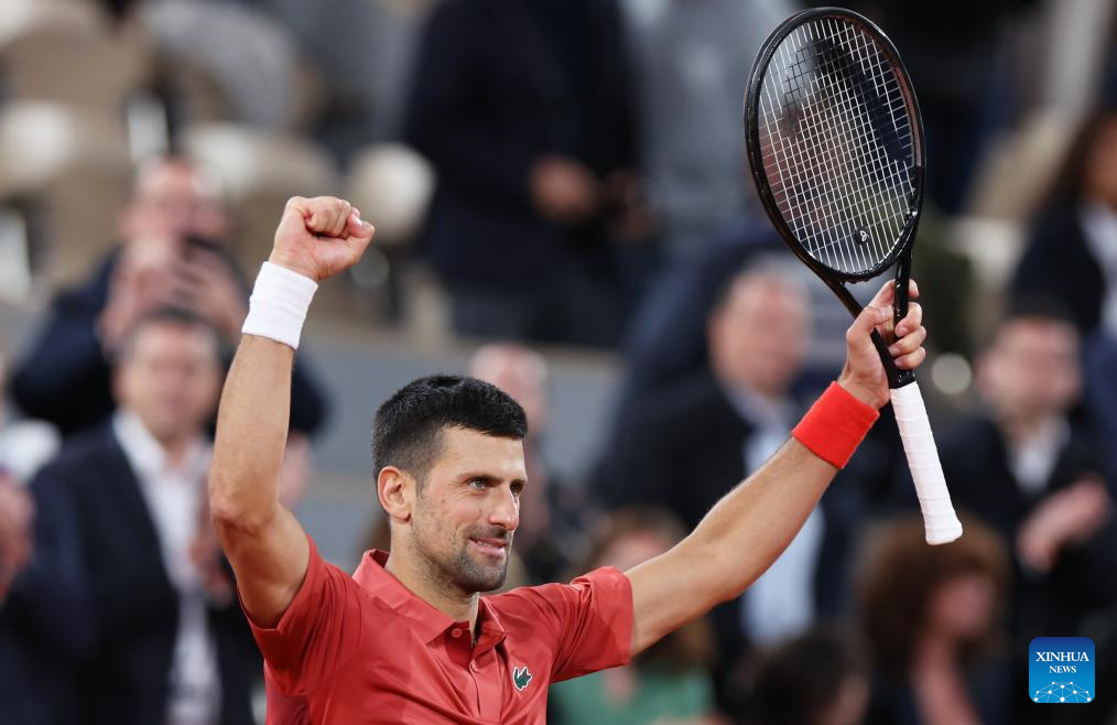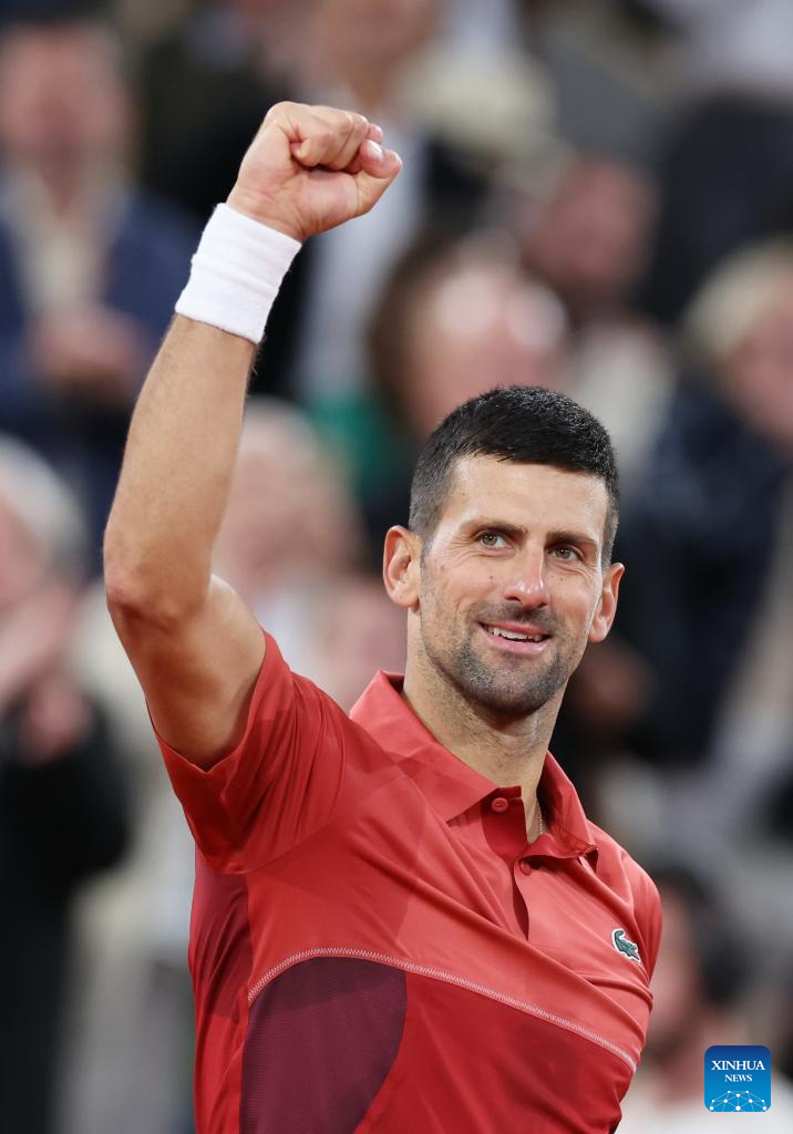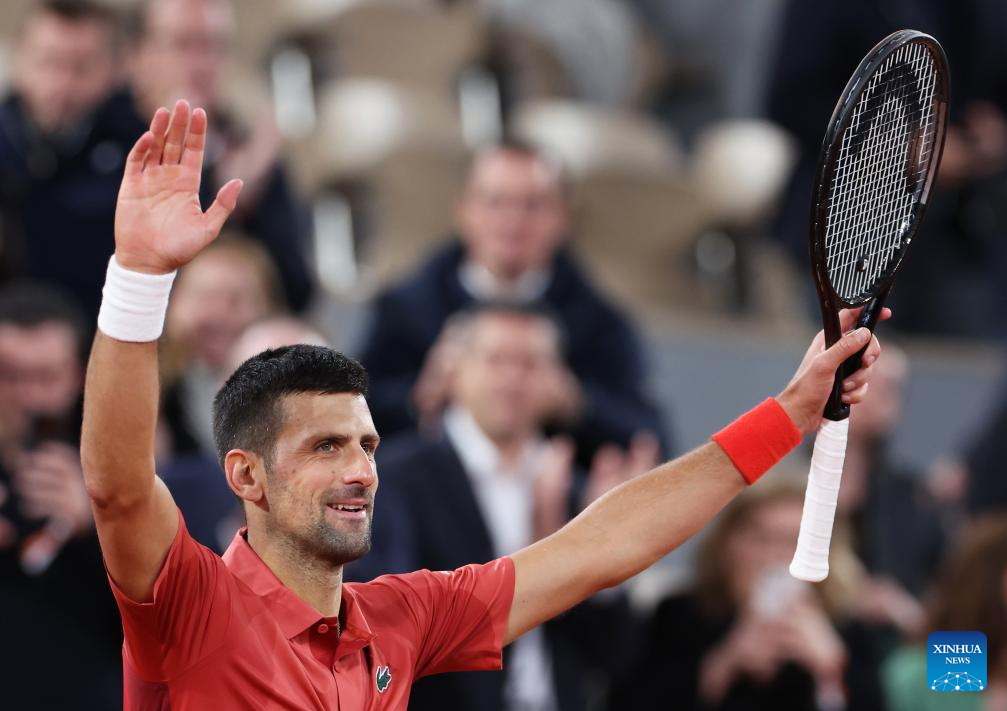 PARIS, 31 mayo, 2024 (Xinhua) -- Imagen del 30 de mayo de 2024 de Novak Djokovic, de Serbia, reaccionando al término del partido de la segunda ronda de individuales masculinos entre Novak Djokovic, de Serbia, y Roberto Carballes Baena, de España, en el torneo de tenis Abierto de Francia, en Roland Garros, en París, Francia. (Xinhua/Gao Jing)