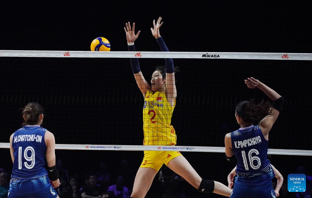 MACAO, 1 junio, 2024 (Xinhua) -- Yuan Xinyue (d), de China, compite durante el partido preliminar entre Tailandia y China de la Liga de Naciones de Voleibol 2024 femenina de Macao, en Macao, en el sur de China, el 1 de junio de 2024. (Xinhua/Lui Sui Wai)