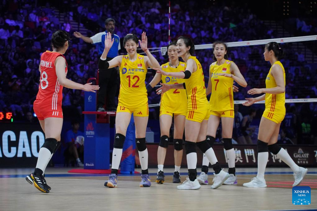 MACAO, 1 junio, 2024 (Xinhua) -- Jugadoras de China festejan una anotación durante el partido preliminar entre Tailandia y China de la Liga de Naciones de Voleibol 2024 femenina de Macao, en Macao, en el sur de China, el 1 de junio de 2024. (Xinhua/Lui Sui Wai)