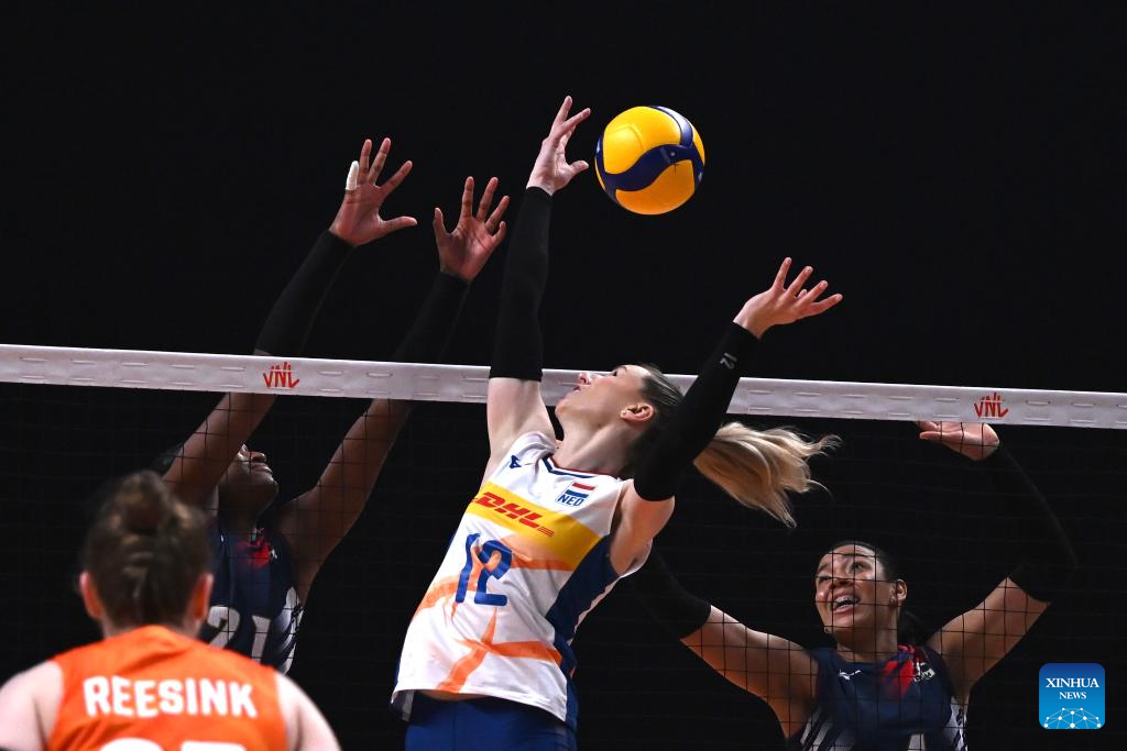 MACAO, 1 junio, 2024 (Xinhua) -- Imagen del 31 de mayo de 2024 de Britt Bongaerts (2-d), de Países Bajos, compitiendo durante el partido preliminar entre Países Bajos y República Dominicana de la Liga de Naciones de Voleibol 2024 femenina de Macao, en Macao, en el sur de China. (Xinhua/Guo Yuqi)