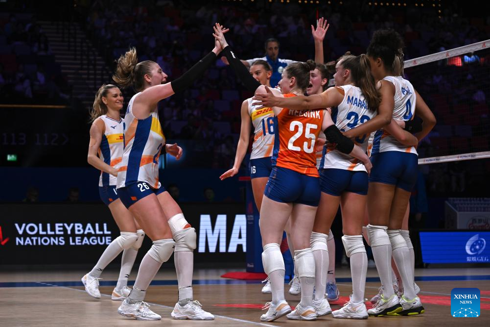 MACAO, 1 junio, 2024 (Xinhua) -- Imagen del 31 de mayo de 2024 de jugadoras de Países Bajos festejando la victoria del partido preliminar entre Países Bajos y República Dominicana de la Liga de Naciones de Voleibol 2024 femenina de Macao, en Macao, en el sur de China. (Xinhua/Guo Yuqi)