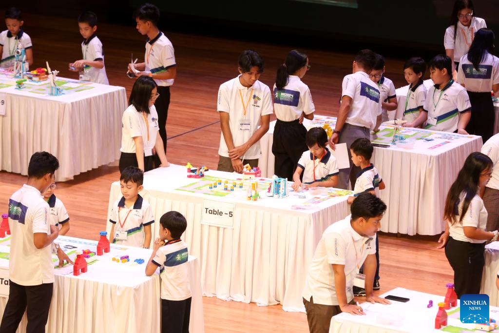 YANGON, 1 junio, 2024 (Xinhua) -- Estudiantes compiten durante el Torneo de Myanmar del Concurso Mundial de Robots 2024 en el Teatro Nacional, en Yangón, Myanmar, el 1 de junio de 2024. Jóvenes innovadores de todo Myanmar se reunieron para mostrar sus habilidades robóticas en la primera edición del Concurso Mundial de Robots, celebrado el sábado en el Teatro Nacional de Yangón. (Xinhua/Myo Kyaw Soe)