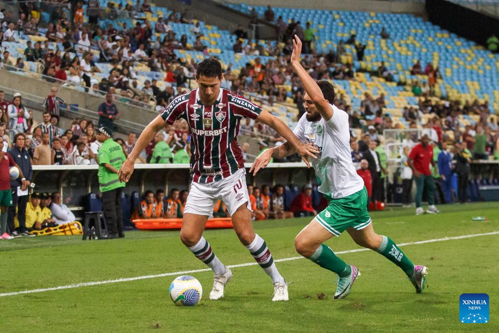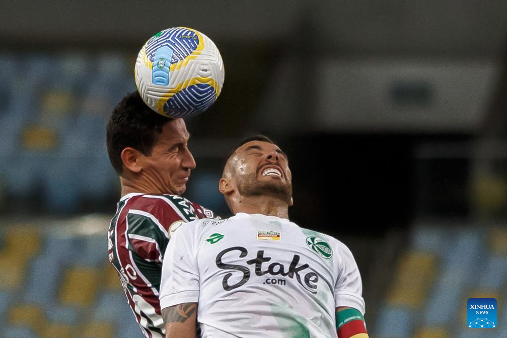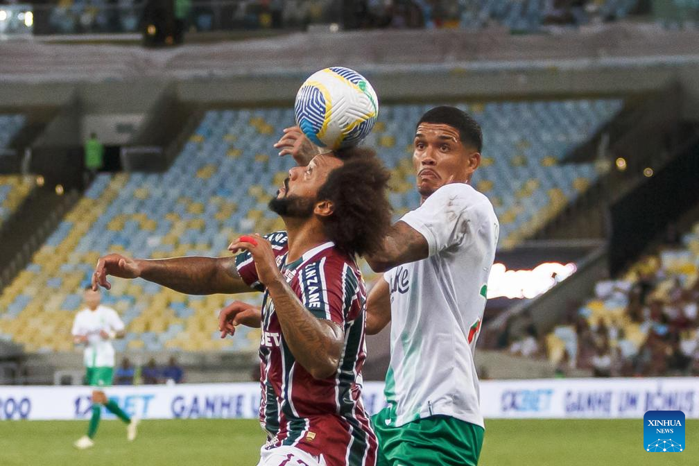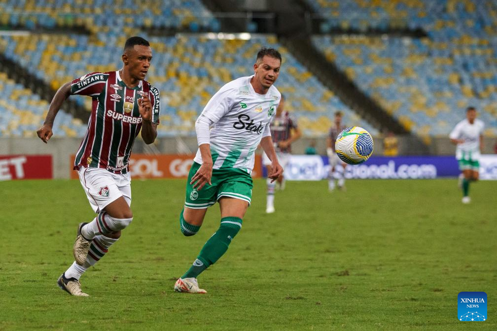 RIO DE JANEIRO, 2 junio, 2024 (Xinhua) -- Imagen del 1 de junio de 2024 del jugador Marquinhos (i), de Fluminense, disputando el balón con Zé Marcos (d), de Juventude, durante el partido correspondiente a la jornada 7 del Campeonato Brasileño Serie A celebrado en el Estadio Maracaná, en Río de Janeiro, Brasil. (Xinhua/Claudia Martini)
