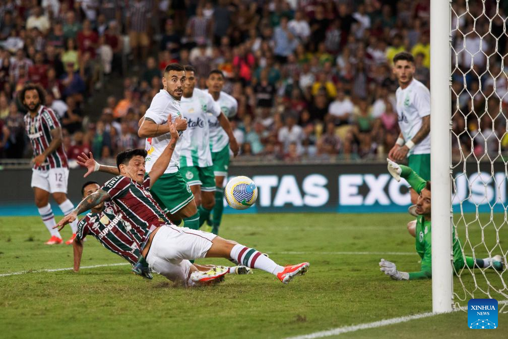 RIO DE JANEIRO, 2 junio, 2024 (Xinhua) -- Imagen del 1 de junio de 2024 del jugador Germán Cano (i-abajo), de Fluminense, intentando rematar el balón a la portería de Juventude durante el partido correspondiente a la jornada 7 del Campeonato Brasileño Serie A celebrado en el Estadio Maracaná, en Río de Janeiro, Brasil. (Xinhua/Claudia Martini)