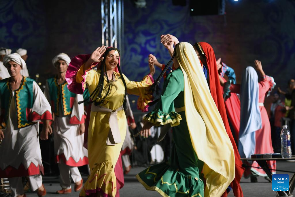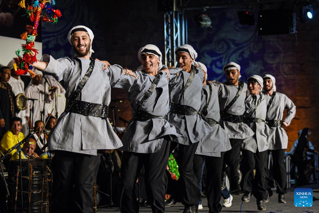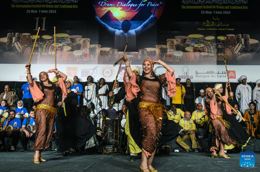 EL CAIRO, 2 junio, 2024 (Xinhua) -- Imagen del 1 de junio de 2024 de artistas realizando una presentación en la ceremonia de clausura del 11º Festival Internacional de Tambores y Artes Tradicionales, en El Cairo, Egipto. El festival de 7 días bajo el lema "Tambores, Diálogo para la Paz" concluyó aquí el sábado por la noche. (Xinhua/Ahmed Gomaa)