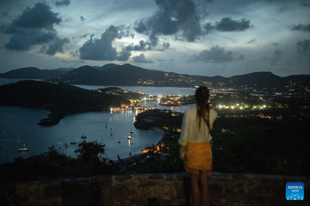 SAINT JOHN, 1 junio, 2024 (Xinhua) -- Imagen del 29 de mayo de 2024 de una turista disfrutando de una vista nocturna en Shirley Heights, en Antigua y Barbuda. (Xinhua/Li Muzi)
