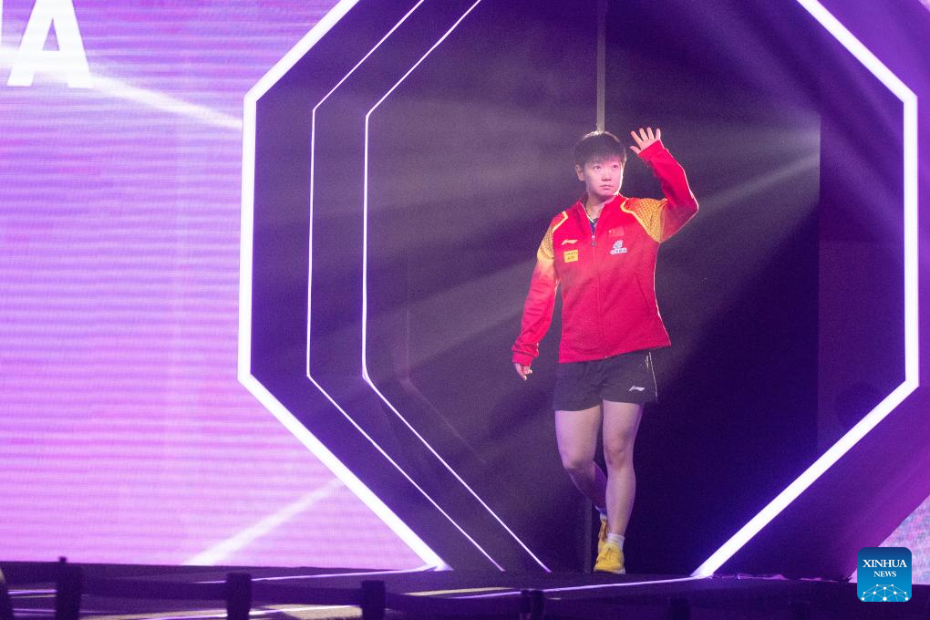 CHONGQING, 3 junio, 2024 (Xinhua) -- Sun Yingsha entra previo a la final de individuales femeninos entre Wang Manyu, de China, y Sun Yingsha, de China, en el WTT Champions Chongqing 2024, en Chongqing, en el suroeste de China, el 3 de junio de 2024. (Xinhua/Tang Yi)
