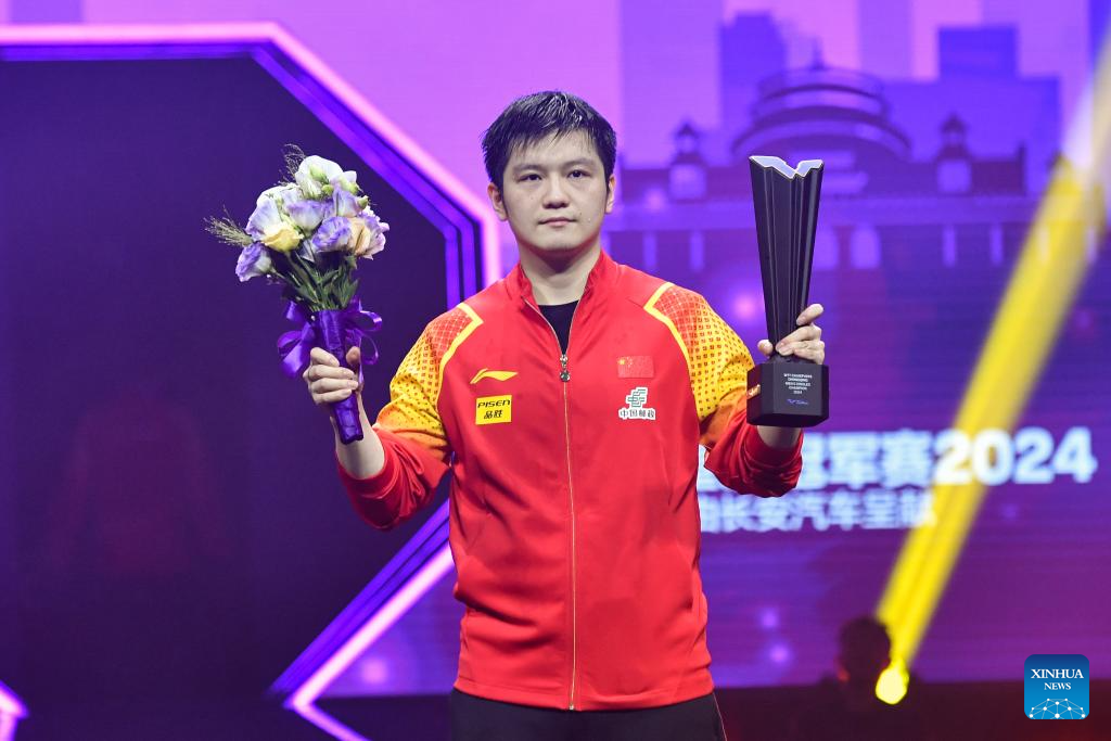 CHONGQING, 3 junio, 2024 (Xinhua) -- El medallista de oro, Fan Zhendong, de China, reacciona durante la ceremonia de premiación de individuales masculinos en el WTT Champions Chongqing 2024, en Chongqing, en el suroeste de China, el 3 de junio de 2024. (Xinhua/Zhang Ziyu)