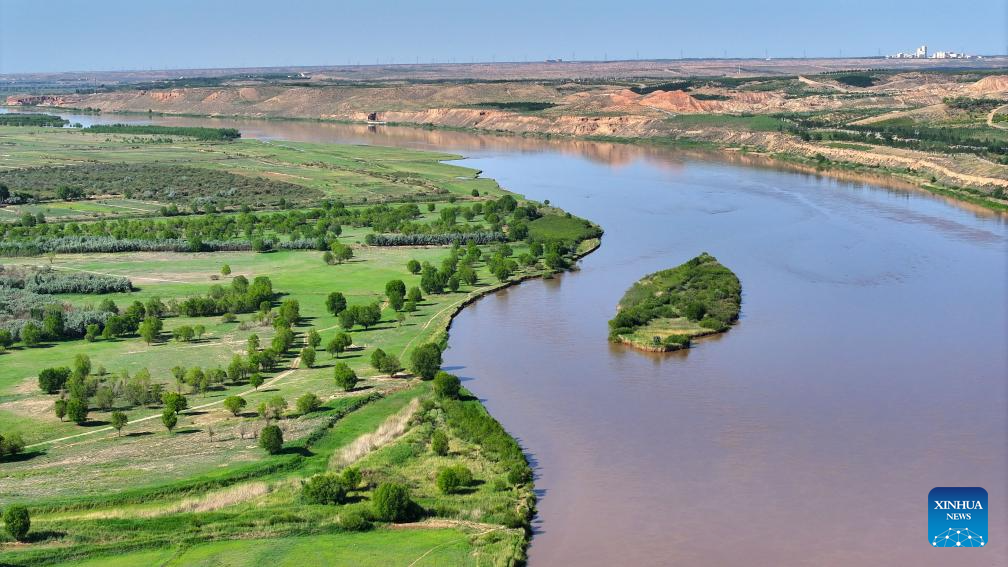 YINCHUAN, 3 junio, 2024 (Xinhua) -- Vista aérea tomada con un dron el 30 de mayo de 2024 de una sección del río Amarillo en Yinchuan, en la región autónoma hui de Ningxia, en el noroeste de China. El río Amarillo, el segundo río más grande de China después del Yangtze, es apodado "río madre". En años recientes, se han realizado continuos esfuerzos para proteger su ecología, mientras la vitalidad ha regresado a la cuenca del río Amarillo en Ningxia. (Xinhua/Wang Peng)