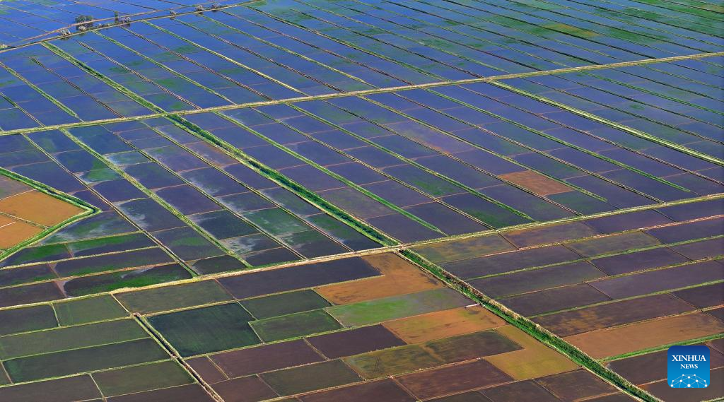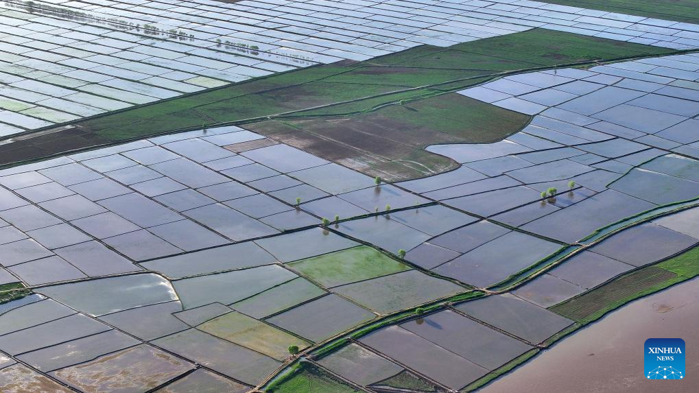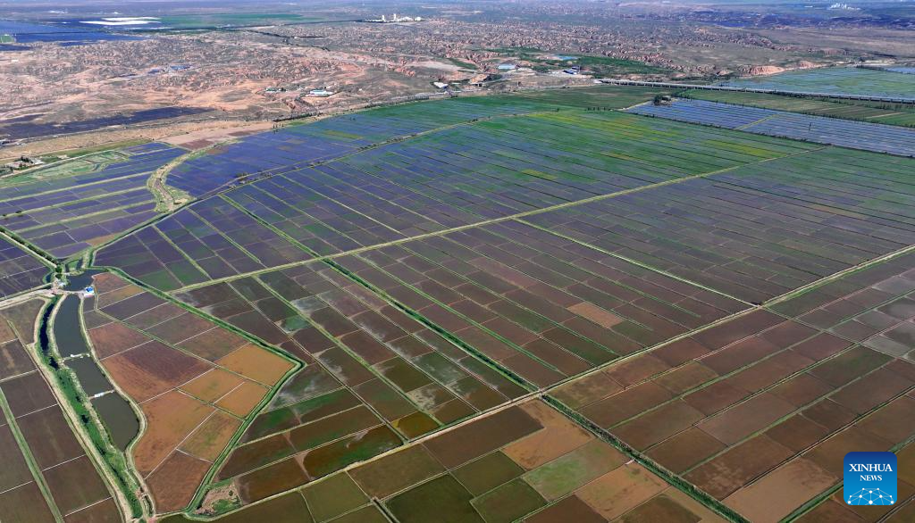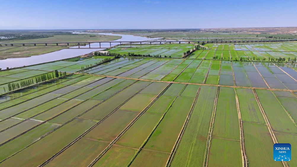 YINCHUAN, 2 junio, 2024 (Xinhua) -- Vista aérea tomada con un dron el 30 de mayo de 2024 de los campos de arroz a lo largo del río Amarillo, en Yinchuan, en la región autónoma hui de Ningxia, en el noroeste de China. Esta temporada de plantado de arroz ha llegado a su fin. Un abundante suministro de agua y luz del Sol en junio inyecta un vigor extra para estas plántulas recién plantadas. (Xinhua/Wang Peng)