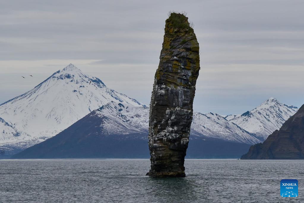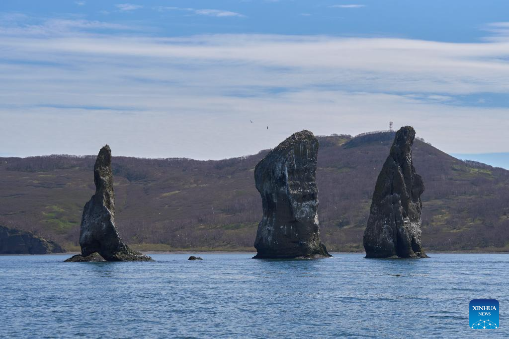 PETROPAVLOVSK-KAMCHATSKY, 3 junio, 2024 (Xinhua) -- Imagen del 3 de junio de 2024 de la "Roca de los Tres Hermanos", en Kamchatka, Rusia. El territorio de Kamchatka está situado en la parte oriental del Lejano Oriente ruso, bordeando el Mar de Okhotsk al oeste y el Océano Pacífico y el Mar de Bering al este. Su capital es Petropavlovsk-Kamchatsky. (Xinhua/Guo Feizhou)