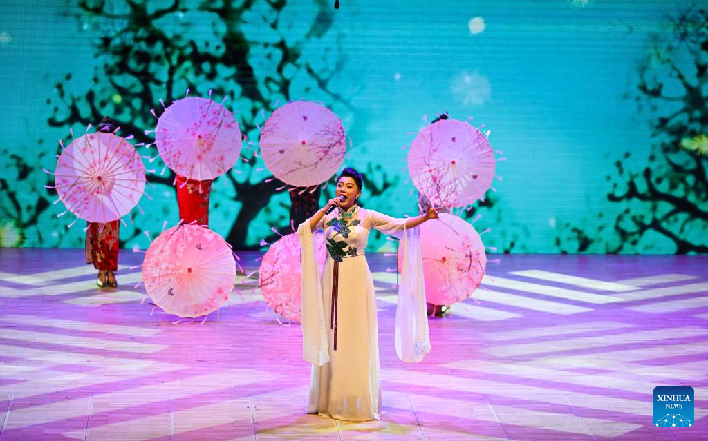 ESTAMBUL, 3 junio, 2024 (Xinhua) -- Imagen del 2 de junio de 2024 de artistas de la región autónoma uygur de Xinjiang de China realizando una presentación en una sala de conciertos, en Estambul, Turquía. Un grupo de artistas de la región autónoma uygur de Xinjiang de China realizó una presentación de música y danza étnica china en Estambul, la ciudad más grande de Turquía, el domingo. El evento, organizado por el Consulado General de China en Estambul, tuvo lugar en una prestigiosa sala de conciertos de la parte europea de la ciudad. (Xinhua/Liu Lei)