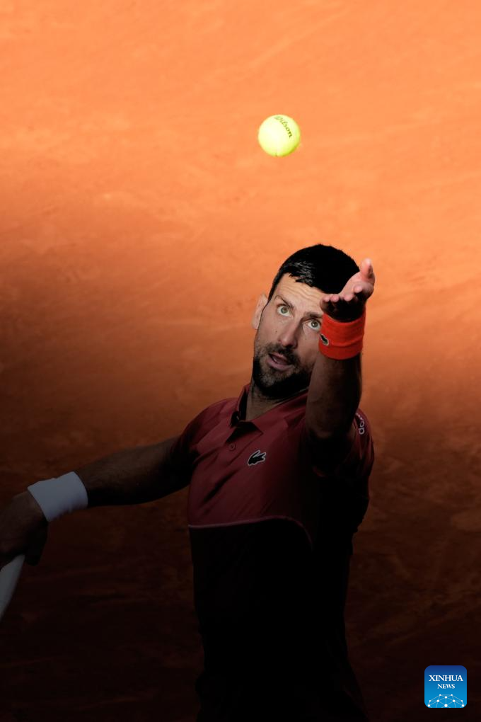 PARIS, 4 junio, 2024 (Xinhua) -- Imagen del 3 de junio de 2024 de Novak Djokovic sirviendo la pelota durante el partido de la cuarta ronda de individuales masculinos entre Novak Djokovic, de Serbia, y Francisco Cerúndolo, de Argentina, en el torneo de tenis Abierto de Francia en Roland Garros, en París, Francia. (Xinhua/Meng Dingbo)